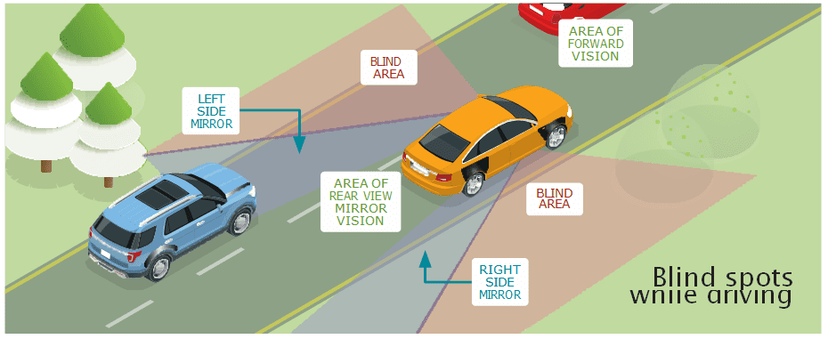 Внутренние и наружные зеркала должны быть отрегулированы, чтобы уменьшить "слепые зоны". Это зоны, в которых автомобилист не может видеть через зеркало позади своего автомобиля (с обеих сторон). Водитель может проверить это, повернув голову. Наружное зеркало должно быть отрегулировано таким образом, чтобы водитель мог видеть кончик ручки передней двери со стороны водителя в правом нижнем углу зеркала. Это позволит автомобилисту видеть часть полос движения слева и сзади автомобиля.