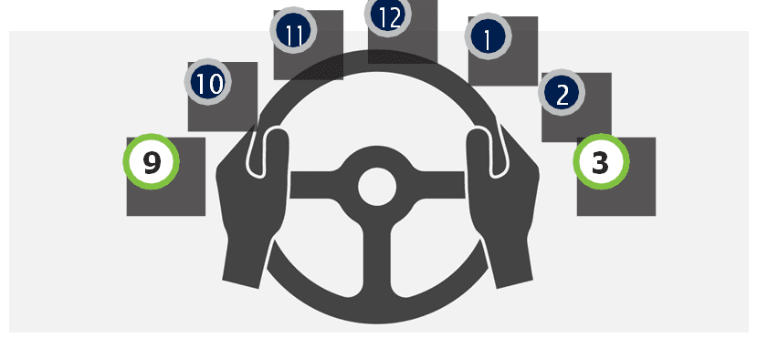 Держание рулевого колеса в руках имеет большое значение. Рулевое колесо можно представить как циферблат часов. При нормальном вождении автомобилист должен держать рулевое колесо за внешний обод в положениях "9" и "3 часа", держа большие пальцы вдоль циферблата колеса. Такой захват рулевого колеса снижает риск получения травмы кисти, запястья или руки в случае срабатывания подушки безопасности. Автомобилист никогда не должен поворачивать рулевое колесо, держа его с внутренней стороны обода, ладонь направлена внутрь. Рулевое колесо следует держать крепко, но не слишком сильно, по мере увеличения скорости автомобиля, как можно устойчивее. Обе руки всегда должны находиться на руле, за исключением случаев переключения передач или подачи сигналов рукой.
