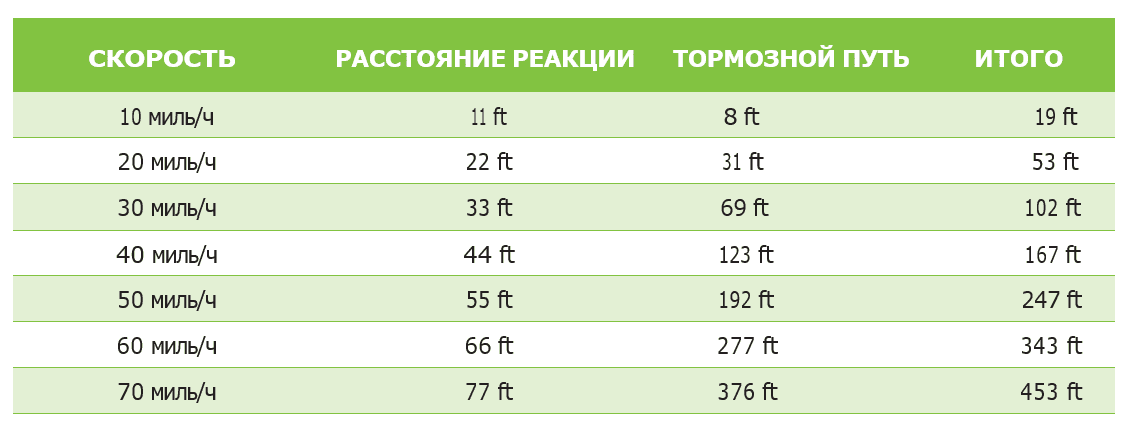 Скорость автомобиля составляет 88 футов в секунду при скорости 60 миль в час. Обычное время реакции большинства автомобилистов в большинстве дорожных условий составляет ¾ секунды. Замедление составляет приблизительно 14 футов в секунду.